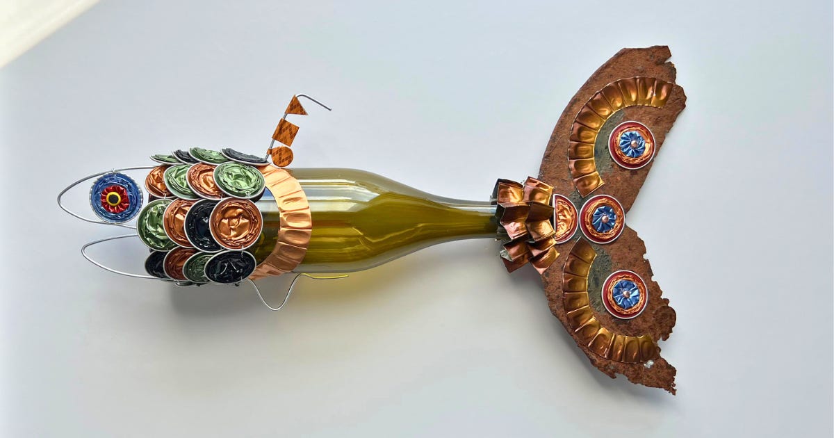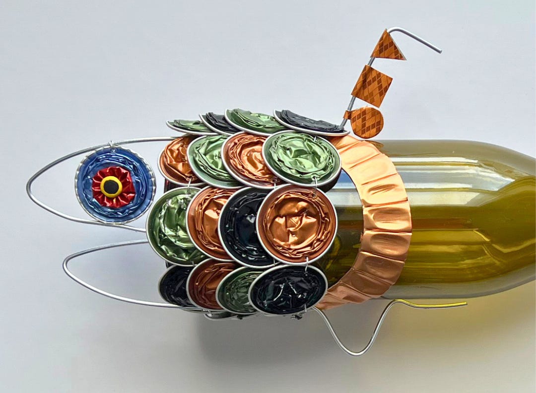 For a couple of weeks before that night, I had an idea in my head for a new art piece. I wanted to make a fish out of a wine bottle and metal. Rusted metal, specifically. And Nespresso capsules, of course.
